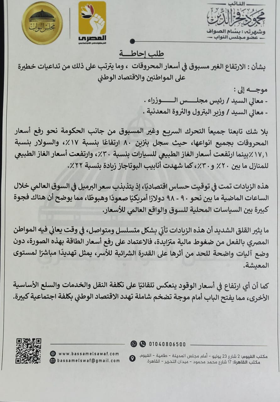 تقدم النائب بسام الصواف عضو مجلس النواب عن الحزب المصري الديمقراطي الاجتماعي بطلب إحاطة إلي المستشار هشام بدوي رئيس مجلس النواب ، موجه إلى رئيس مجلس الوزراء ووزير البترول والثروة المعدنية بشأن الارتفاع الغير مسبوق في أسعار المحروقات، وما يترتب على ذلك من تداعيات خطيرة على المواطنين والاقتصاد الوطني.